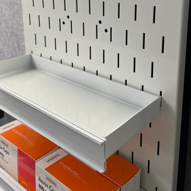 Tämä metallinen, rei’itetty Minihylly on suunniteltu helppoon tuotesijoitteluun ja tehokkaaseen lisämyyntiin. Se sopii erinomaisesti palvelutiskeille, kassapisteisiin, asiakaspalvelupisteisiin ja ahtaisiin myymälätiloihin, joissa tuotteet halutaan näkyvästi esille ilman, että pöytätilaa kuluu liikaa.